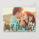 Jolie typographie cursive avec un look à la mode lettré à la main et le style simple de cette carte postale photo comprend votre photo fiançailles, et "Save the Date" info en texte noir sur le devant. Sur le dos, il y a de l'espace pour tous les détails importants, la date du mariage, le site Web et un message personnel.