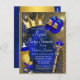 Carte postale de baby shower pour prince en bleu royal avec de mignons éléments en bleu royal et or sur un beau fond bleu royal et or. Ce faire-part de baby shower pour prince royal est facilement personnalisable avec les détails de votre événement.