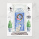 Annoncez votre nouvelle adresse avec notre faire-part élégante avec un chat persan, une porte d'entrée bleue, un tapis de bienvenue, une ardoise, des topiaires et une couronne fleurie posée sur un arrière - plan en brique grise.