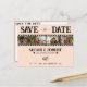 Faire-part de mariage rétro avec carte de collage de photos en bande de film. Fond rose clair / pêche avec anneaux de mariage. Personnalisez avec vos détails de mariage personnels et photos de couple nouvellement mariés.