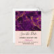 Carte de faire-part avec un beau motif abstrait présentant un design en marbre. Des couleurs violettes riches se mélangeant avec des rubans tourbillonnants de couleur faussement dorée qui se mélangent et se fondent dans le design. Une couche de couleur pêche en dessous du motif avec une bande élégante en faux-doré entre les deux.