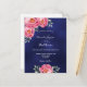 Une faire-part de mariage moderne et tendance. Un arrière - plan bleu marine bleu foncé. La couleur bleue est inégale. Décoré de fleurs de pivoines roses luxuriantes, de fleurs et de vert gris. Modèles pour vos noms et informations de cérémonie. Les noms sont écrits avec un script de style moderne écrit à la main. Texte blanc. Retour : conception simple de carte postale.