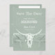 Style western rustique campagne vintage antique cowboy. Faire-part de mariage drôle de couleur vert sauge pastel. Cartes d'invitation crâne de taureau. Utilisez un peu d'humour avec ce design inspiré de la ferme amusant et mignon. Vieux ouest sauvage, unique. Animal de ferme tendance cool. Fond vert avec lettrage blanc. Personnalisez le script et la typographie. Cherchez des invitations assorties dans cette collection. Image copyright Marg Seregelyi Photography.