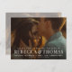 Une superposition de type moderne avec de grands noms et une photo en plein écran sont les caractéristiques de ce faire-part de mariage. Cliquez sur le bouton modifier pour personnaliser ce design.