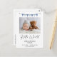 Carte de faire-part de naissance garçon avec un drapeau de bunting bleu, une en-tête en calligraphie moderne et un texte noir. Cette carte de faire-part de naissance moderne est un moyen doux d'annoncer la naissance de votre nouveau-né garçon.