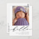 Cette élégante carte postale faire-part de naissance présente une calligraphie moderne qui dit "bonjour" et une grande photo. Sous le script, vous pouvez ajouter le nom complet de votre bébé, la date de naissance, les statistiques de naissance et vos noms. Au verso de la carte postale, vous pouvez écrire un message personnalisé aux proches.