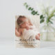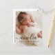Cette élégante carte postale faire-part de naissance est dotée de calligraphie moderne et d'une grande photo. Le prénom de votre nouveau-né est écrit en calligraphie noire sur le bas de la carte. Ci-dessous, vous pouvez ajouter le nom complet de votre bébé, la date de naissance et les statistiques de naissance. Au verso de la carte postale, vous trouverez de l'espace pour écrire un message personnalisé plus long aux destinataires.