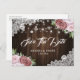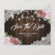 Elégant mariage rustique rose pâle rose floral enregistrer les cartes postales datées idéales pour une soirée de mariage romantique rose pâle et rustique. La carte postale datant est garnie d'un arrière - plan en bois de grange orné de roses roses blanches, de dentelle fleurie blanche et de lampes à cordes. Éléments correspondants disponibles.