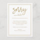 Cette carte de notification simple et élégante est un moyen de s'excuser auprès des clients ou des amis lorsque vous devez annuler, reprogrammer ou reporter un événement ou un mariage. Un script manuscrit moderne à l'aspect or faux ajoute une touche stylée, tandis que le cadre doré rectangulaire ajoute un look formel et classique. Utilisez ces cartes de notification pour toute annulation, report ou reprogrammation.