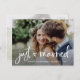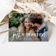 Cette carte postale fantaisiste et moderne d'elopement ou de mariage comporte deux de vos photos de mariage préférées, avec un script rustique à la mode écrit à la main et un petit coeur élégant et dit "juste marié". Le dos contient une deuxième photo avec une superposition translucide, et plus de détails et d'informations de votre mariage. Un look simple et tendance qui est la façon parfaite de faire savoir à la famille et aux amis que vous avez noué le noeud!