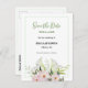 Annonce Enregistrer La Date conçue d'après mon illustration aquarelle de lys calla blancs et de roses bébé rose avec leurs pétales douces et délicates, et des feuilles vertes fraîches et des détails fins des pétales et du feuillage. Le produit a un fond blanc uni et un rectangle sur le bord extérieur. Personnalisez-le dans ma boutique pour un design personnalisé.