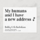 Mon humain et moi avons une nouvelle adresse ! Laissez votre meilleur ami annoncer votre déménagement avec cette carte d'annonce de déménagement de compagnie drôle et mignonne.