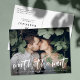 Devez-vous changer la date de votre mariage ? Nos élégantes cartes de report de mariage "change the date" sont parfaites pour informer vos invités de votre nouvelle date de mariage. La carte tendance "change the date" comporte la mention "worth the wait" (ça valait la peine d'attendre) dans un script écrit à la main et en blanc, superposé à votre photo de fiançailles horizontale. Personnalisez la carte en ajoutant vos noms, votre adresse de retour, les détails du mariage, le site web du mariage, etc.