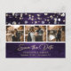 Personnalisée violet et or photo mariage enregistrer la date des cartes postales avec une élégante police de script de feuille d'or faux. Notre mariage, sauf la date, présente un montage photo de 3 images contre un arrière - plan de bois rustique violet orné de lampes à cordes. Personnalisez facilement cette photo rustique enregistrez la carte postale de la date avec vos images et les détails du mariage, y compris un site Web mariage, si vous le souhaitez. Pour des demandes personnalisées, envoyez-nous un message.
