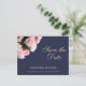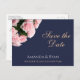 Élégant bouquet de roses roses Mariage Enregistrer la date Annonce Carte postale. Le texte est dans un script moderne. Beau bouquet rose sur fond bleu nuit. Vous pouvez facilement personnaliser tout le texte sur l'avant et l'arrière de la carte - le personnaliser avec le nom de la mariée, le nom du marié, la date du mariage, l'heure, le lieu, et changer ou effacer tout texte.