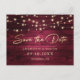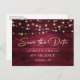 Mariage en bois rustique bordeaux sur mesure enregistrer les cartes postales de date avec une police en faux feuille d'or et avec un arrière - plan en bois rustique orné de lampes à cordes. Personnalisez facilement cette rustique enregistrer la carte postale de date avec vos détails mariages. Pour des demandes personnalisées, envoyez-nous un message.