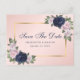 Elégant mariage floral bleu marine, or et rose vif, enregistrez les cartes datant avec un cadre doré orné de roses bleus et bleus. Éléments correspondants disponibles.