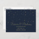 Ces cartes postales datées sont parfaites pour tout couple qui planifie une fête mariage romantique. Le design est composé d'un arrière - plan bleu marine élégant avec d'élégantes étoiles en chute d'or et une formulation modifiable. Le design simple peut être personnalisé pour convenir à votre événement spécial et sera le faire-part parfait pour toute fête à thème moderne, y compris : douches nuptiales, fiançailles, wedding showers, fêtes d'anniversaire et bien plus encore.