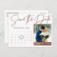 Faire-part de mariage photo sur carte postale avec écriture élégante. Carte simple mais élégante pour annoncer la date du mariage. Le recto de la carte comporte un calendrier pour marquer la date du mariage et les noms des mariés ainsi qu'un espace pour la photo du couple. Le verso de la carte a un fond en faux or rose avec d'autres détails du mariage ainsi que l'adresse de retour. La carte peut être personnalisée en déplaçant le petit carré sur les nombres pour sélectionner la date du mariage. Pour toute personnalisation supplémentaire, n'hésitez pas à me contacter.