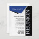 Il n'y a pas à s'y tromper - il s'agit d'une réunion de classe sauf la carte de date. Le design sophistiqué en bleu, noir, argent et blanc est un moyen élégant d'annoncer l'événement à venir. Des rayures grises subtiles dans l'arrière - plan ajoutent intérêt et profondeur à la conception.