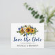 Cartes d'enregistrement de date de style bohème aquarelle avec un fond blanc classique pouvant être changé en n'importe quelle couleur, un arrangement floral de tournesol, des plumes et un modèle d'enregistrement de date moderne.