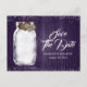 Carton de faire-part de mariage rustique violet représentant un pot Mason et des coeurs en toile de jute sur un fond en bois rustique.