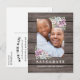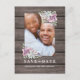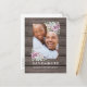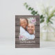 Cartes postales "save the date" de style chic de jardin campagnard présentant un fond de grange en bois rustique, une photo des mariés, un arrangement floral succulent dans un coin et un modèle de texte de mariage facile à personnaliser.