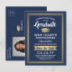 Partagez la joyeuse nouvelle d'une fête de remise de diplôme à venir avec des invitations de carte postale "save the date" personnalisées avec une photo et un motif en bleu marine et or faux métal. L'image et le texte sur ce modèle sont faciles à personnaliser avec le nom du diplômé, l'année de promotion et d'autres détails d'annonce de votre choix. Le design présente une bordure rayée élégante, une calligraphie moderne et élégante, une typographie classique vintage et une photo préférée, telle qu'une photo de fin d'études ou une image de la cérémonie de remise des diplômes. Veuillez noter que l'or est une couleur ombrée imprimée, et non une feuille métallique. Ces cartes de fin d'études élégantes sont un moyen raffiné de partager la célébration d'un jour spécial avec la famille et les amis. Félicitations au diplômé !