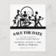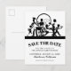 Cartes postales rétro de save the date BBQ avec un fond blanc simple qui peut être changé en n'importe quelle couleur, un rassemblement de personnes autour d'un barbecue et un modèle de save the date de fête facile à personnaliser.