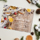 Plongez dans la magie réconfortante de Noël avec nos cartes de save-the-date rustiques de campagne. Ces cartes charmantes offrent une escapade nostalgique dans un pays des merveilles festif où le fond en bois chaleureux, les lumières scintillantes et le tissu de jute préparent le terrain pour une soirée festive. L'arôme des bâtonnets de cannelle et des pommes émane de la carte, associé à l'acidité des oranges et à la rusticité des pommes de pin, invitant vos invités à une expérience de vacances inoubliable.