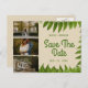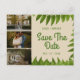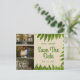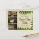 Elégante Save The Date Carte postale avec feuillage vert et trois panneaux pour trois photos préférées sur arrière - plan beige.