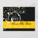Carton de mariage élégant à motif floral en feuille enroulée noire, jaune, avec des feuilles enroulées blanches, des volutes, des boucles et des points jaunes sur fond noir. Il y a une bande jaune avec votre texte en bas. Ce design élégant et chic fait partie d'un ensemble de mariage parfait pour un mariage d'hiver. Il s'agit d'un modèle entièrement personnalisable.