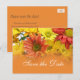 Carte postale colorée rouge, jaune, orange de marguerite pour enregistrer la date de photographie pour les mariages d'été, d'automne ou de vacances. Art photo floral.
