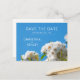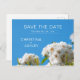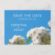 Belle carte de mariage floral "save the date" avec des roses blanches oniriques et un ciel d'été bleu clair.