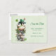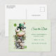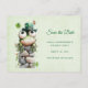 Save the date postcard with a cute St. Patrick's Day image. A green frog with big cartoon eyes sitting on a stone wall. Wearing a green top hat with a shamrock and a little friend sitting on top of his hat.