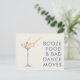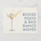 Faites de votre faire-part un moment inoubliable grâce à ce mariage unique et amusant, sauvez les cartes postales datées! Doté d'un design ludique en verre de champagne et d'une bague pétillante à l'intérieur, l'avant déclare avec audace "Booze, food, and bad dance move", parfait pour les couples qui aiment célébrer avec humour et style. Personnalisez ce design avec vos noms, date mariage et emplacement pour créer une date de sauvegarde qui apportera un sourire aux visages de vos invités. L'arrière comprend de l'espace pour votre adresse de retour et des détails supplémentaires sur le mariage, ce qui permet à chacun de marquer facilement son calendrier. Ces cartes postales allient plaisir et fonctionnalité - aucune enveloppe requise - offrant un moyen facile de partager vos nouvelles passionnantes. Que vous planifiez un mariage chic, décontracté ou amusant, ce design donne le ton parfait. Besoin d'aide pour customiser ou avoir une demande spéciale? Cliquez sur le bouton de contact ci-dessous, et je vous aiderai à créer une date d’enregistrement aussi unique que votre histoire d’amour!"**