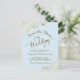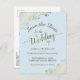 Cette belle carte postale à l'exception de la date dispose d'un design magnifique avec un arrière - plan bleu poudre pâle, calligraphie de script or, et frileusement orné de boucles et tourbillons de faux feuille dans les coins. Le dos a de la place pour une note personnalisée avec votre site Web et d'autres informations. Belle façon de faire connaître votre prochain mariage à vos amis et à votre famille.