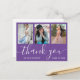 Graduation 3 Photo Collage Purple Merci Postcard. Pour plus de personnalisation, cliquez sur le bouton "Customiser" et utilisez notre outil de conception pour modifier ce modèle.