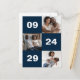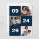 Carte postale de sauvegarde de date avec de grands nombres gras en blanc sur fond bleu marine. Espace pour trois de vos photos spéciales. Au dos, il y a Enregistrez la date, les prénoms en police de caractères script, Se marient et un endroit pour vos informations de mariage. Parfait pour ceux qui aiment la typographie et la simplicité avec style.