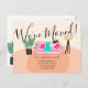 Nous avons bougé ! Une jolie et amusante illustration originale d'un salon avec un canapé rose, un coussin, une lampe, un plante de maison et un chat, avec une couverture turquoise et un kit de tricot en mouvement faire-part et une écriture de calligraphie élégante et moderne. Le sol et les couleurs du tapis sont entièrement modifiables et mobiles !