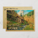 Vintage Iowa Save The Date carte postale dans un style rétro amusant du milieu du siècle. Il dispose d'un paysage boisé rustique avec un cabine en bois et un moulin à roue à eau, et d'un joli ruisseau avec des feuilles d'automne pour une sensation d'automne ou de fin d'été. Cette carte postale Iowa Save The Date sera parfaite pour un mariage de mariage campagnard ou de nature et de camping.