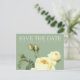 Faire-part de mariage époustouflant et sophistiqué SAVE THE DATE, avec une illustration botanique vintage d'une rose jaune sur fond vert sauge.