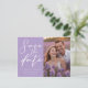 Cette charmante carte de sauvegarde de date en lilas comporte une belle typographie blanche sur un fond violet doux pour une cérémonie de printemps dans l'après-midi à côté de votre photo de fiançailles de couple. Les invitations de carte postale photographique pastel lavande sont un choix de couleur délicat pour une occasion de jardin élégant.