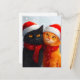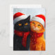 Une scène fantaisiste et festive pleine de joie des fêtes et d'amour avec un chat noir heureux et un chat orange, tous deux portant des chapeaux de Père Noël, entourés de flocons de neige qui tombent.