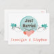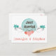 Y'a de l'amour dans l'air ! Annoncez fièrement à vos amis et à votre famille que vous et votre amour venez de vous marier. Cette carte postale de faire-part mariage présente un faire-part Just Married surligné contre un arrière - plan de deux tons bleu cercle avec des tourbillons et des coeurs roses contre un arrière - plan blanc crémeux. Vous pouvez personnaliser la carte avec le nom de la mariée et du marié ou le nom de famille. Vous pouvez customiser le style de police et les couleurs. Les cartes postales faire-part mariages sont une alternative économique aux cartes de voeux lorsque vous voulez annoncer votre mariage. Autres produits et cadeaux dont vous pouvez profiter... com. com. Mots clés : juste+marié, mariage, amour, bleu, rose, coeur, mariage+faire-part, coeurs, nuptiale, rose+et+bleu