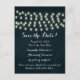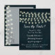 Image scénique classique et sentimentale de chaînes de lumières suspendues d'un côté à l'autre, un peu comme une scène de plein air à la campagne ou une célébration nuptiale de style antique. Fond bleu foncé avec un effet vieilli et des brins d'ampoules claires nues sur le dessus. Conception Copyright © CustomInvitesOnline.com