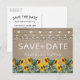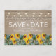 Carte postale de save the date rustique à la campagne avec un fond en tissu toile de jute marron, des guirlandes lumineuses, des tournesols d'été de jardin et un modèle de texte modifiable.