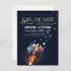 Spécial et unique enregistrer la carte postale date avec belle bocal de mason lunatique avec lumières brillantes - lucioles. Moderne mais vintage, gardez la date parfaite pour les thèmes de mariage campagnard rustique.