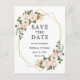 Annonce de mariage Save The Date avec roses roses et magnolias blancs aquarelle élégante comprenant de la verdure botanique et des feuilles d'eucalyptus sur un cadre géométrique doré.
