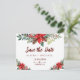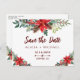Ecriture chic florale d'hiver Rustique rouge bordeaux et vert pin mariage de Noël enregistrer la carte postale à jour avec poinsettias saisonnières, cônes de pin et feuillage.
